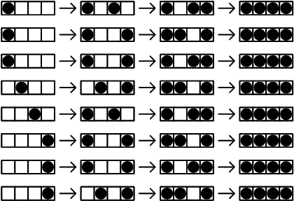 记T(N)为在上述规则下N个人坐N个座位的所有可能性。下图说明T(4)=8。